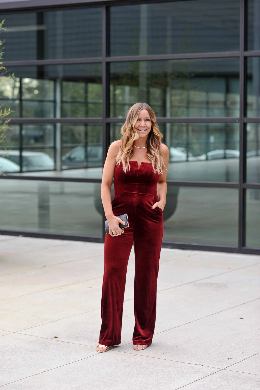 Red Velvet Jumpsuit With Ostrich Feathers Holiday Party Outfit Etsy